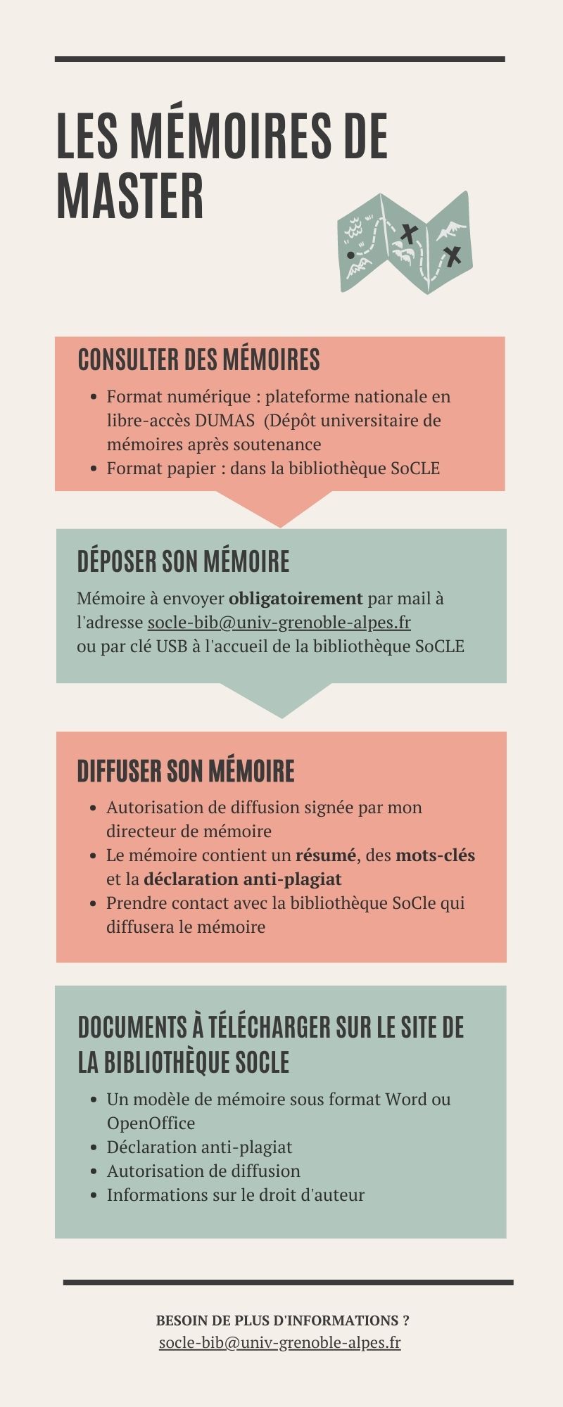 Le mémoire peut être envoyé par mail à l’adresse socle-bib@univ-grenoble-alpes.fr ou transmis directement à l’accueil de la bibliothèque par clé USB. Il doit comprendre un résumé, des mots-clés et une Déclaration anti plagiat . Le dépôt du mémoire doit s'accompagner d'une Autorisation de diffusion signée conjointement par l’étudiant et par le directeur de recherche après la soutenance.